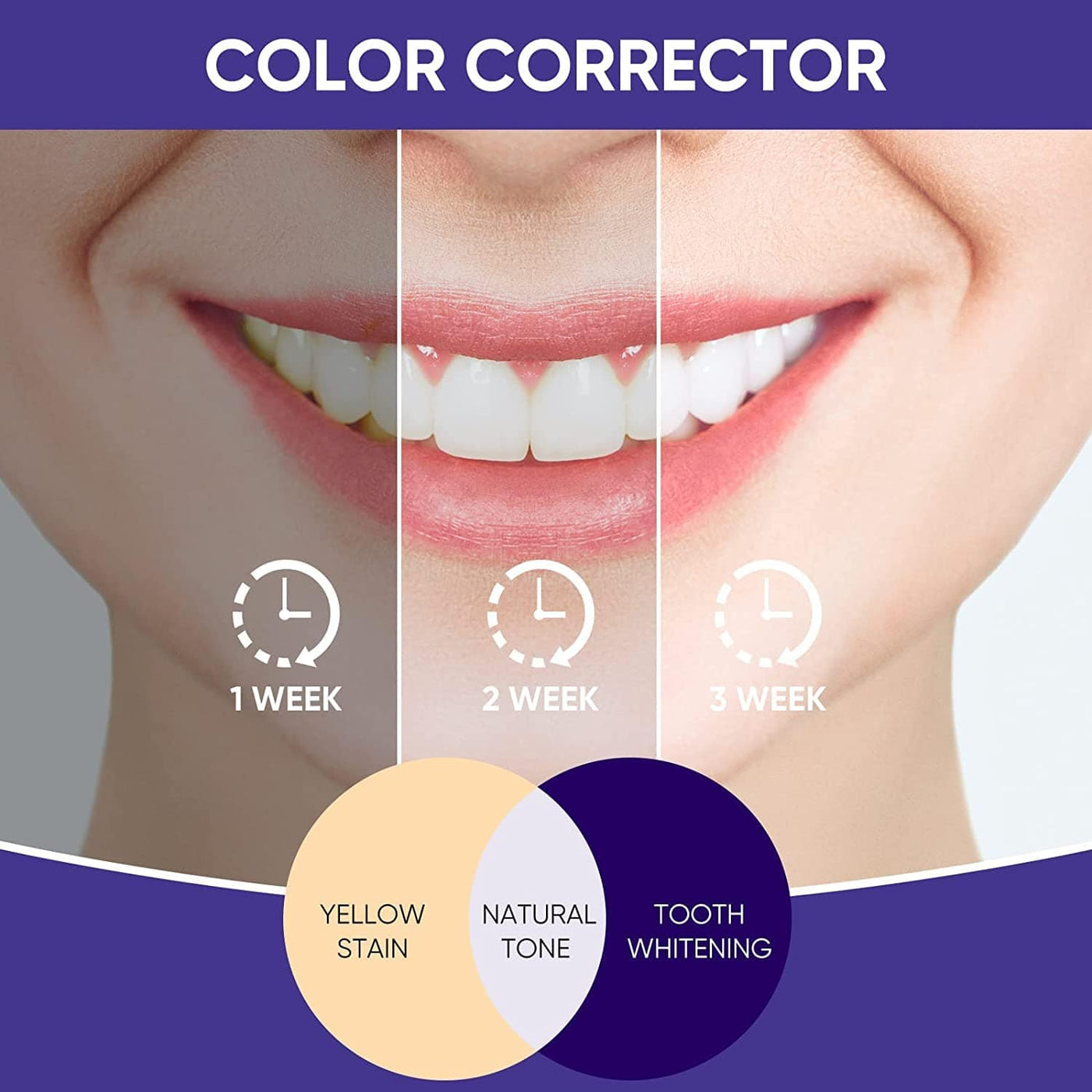 This innovative toothpaste combines advanced technology. Purple is directly opposite yellow on the colour wheel and is, therefore, its complementary colour, so with this Purple Toothpaste like product, a water-soluble purple dye is applied to your teeth to cancel out any yellow undertones and its effective ingredients to combat tooth discoloration caused by various factors such as coffee, tea, wine, tobacco, and aging. This innovative product utilizes cutting-edge color correction technology to neutralize yellow undertones and enhance the whiteness of your teeth.